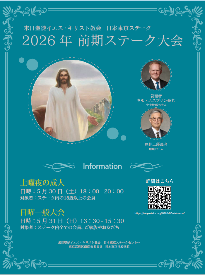 皆様を前期ステーク大会に心から歓迎いたします。ぜひご家族やお友達をお誘いの上、ご参加ください。